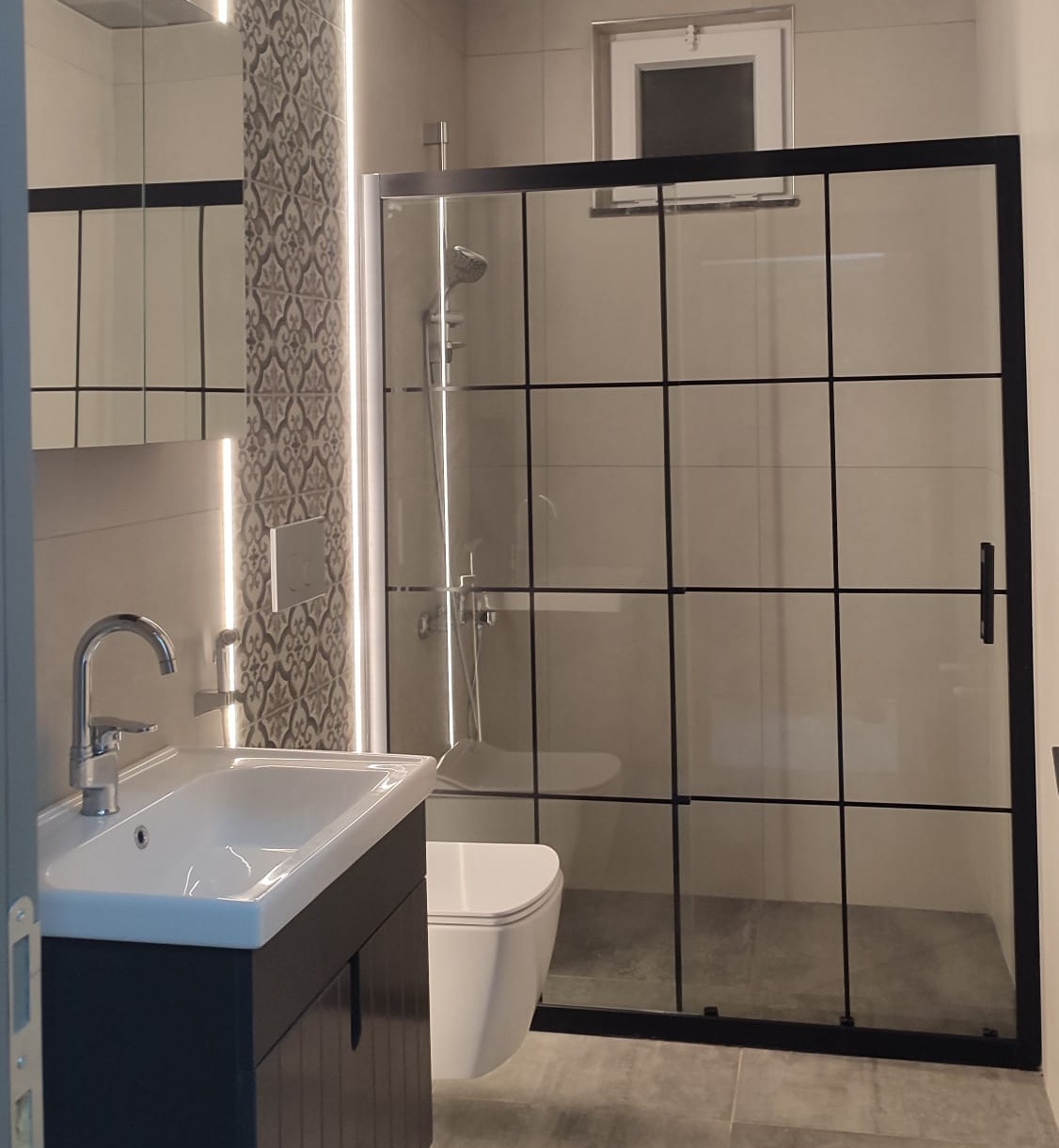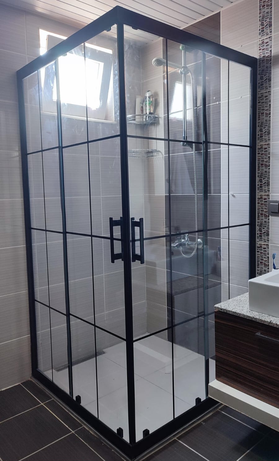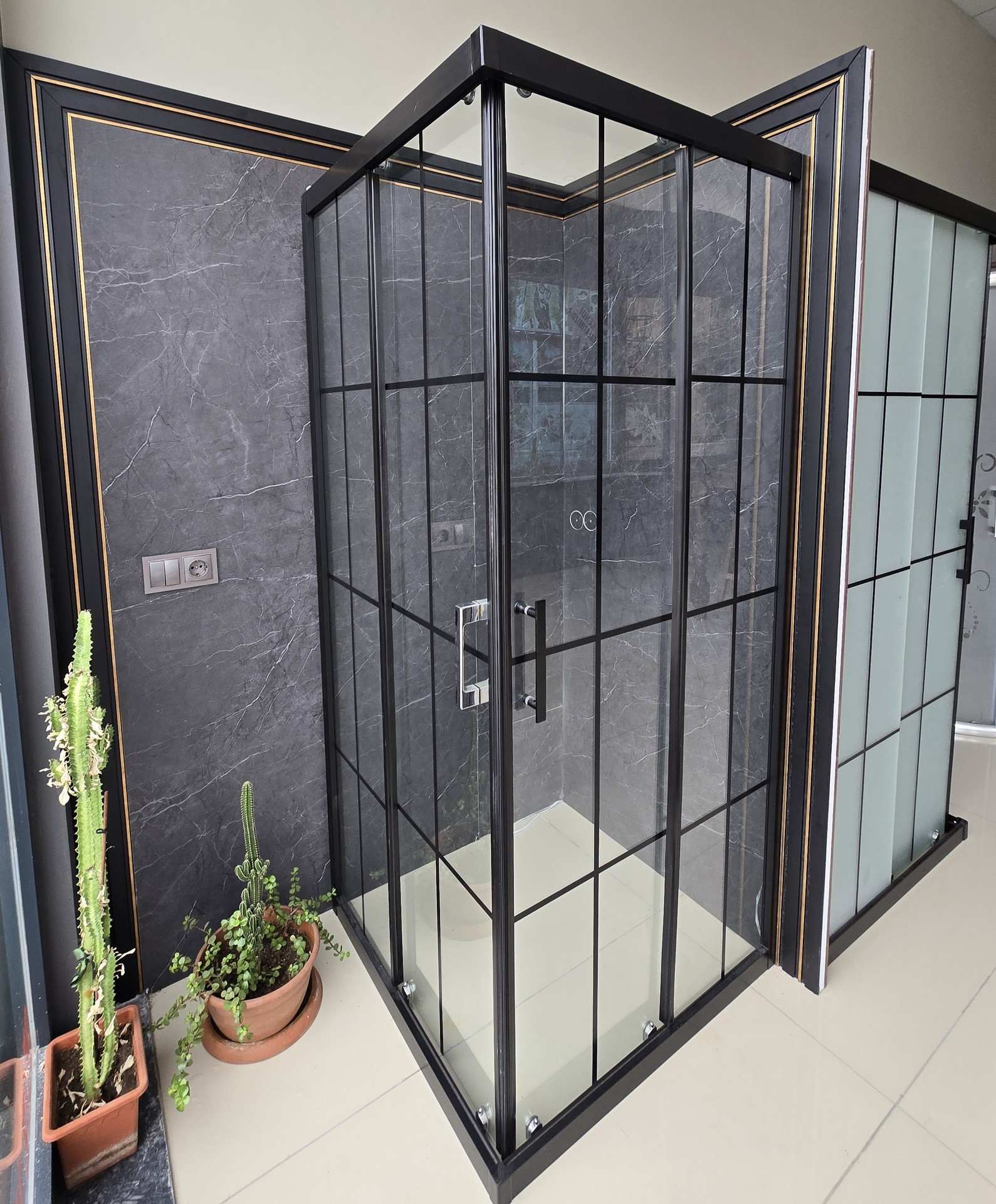 Banyosunda endüstriyel veya modern bir hava yaratmak isteyenler için siyah profilli, karolajlı şık modeller.